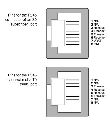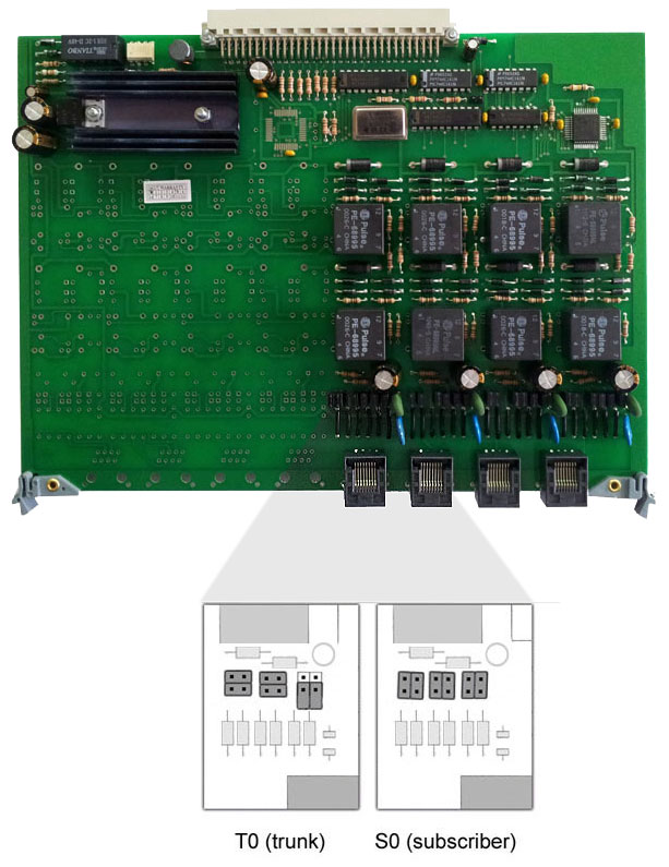 DDLBRAISDNBoardSettingsIn Brief The DDL card contains four RJ-45 type connectors for either subscriber line (S0, NT) or trunk line (T0, TE) connections. For proper S0 or T0 operation, correct hardware and software settings are necessary. RJ45 Pin Description Pin definitions of the RJ-45 connectors are as follows: Jumper Settings Each port can be configured individually as a subscriber (S0, NT) or a trunk (T0, TE) through jumpers on it. Be aware that, setting jumpers only enables correct signals for S0 or T0 on RJ-45 connectors. For proper operation, software settings required by programming. By default, jumpers for all ports are set for S0 operation. To set a BRI interface as a T0 (trunk), four conductor-pairs (of the relevant port) are short circuited with jumpers, whereas two others are left open as shown above. To set a BRI interface as an S0 (subscriber), all six conductor-pairs (of the relevant port) are short circuited with jumpers as shown above. ISDN Bus Connection Schemes Both point-to-point? and point-to-multipoint? connection schemes are possible. With point-to-multipoint connections, both short and extended passive buses are supported. Note that DDL ports have 100 ohms terminating resistors embedded on the board, so that there should not be near-end 100 termination in wiring. Software Setting By default, software settings for all DDL ports are S0. If you set jumpers of a DDL port for T0 operation, its software setting would not change automatically. It would be shown as S0 till you change its interface parameter. To do this, set Important Notes