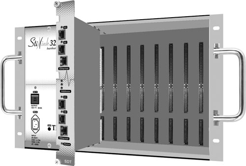 Stillink3200InstallingTheFirstAndMandatorySDTModuleWhen the installation of the SGS module is completed, slide the first and mandatory SDT module into the Slot-2 (see below). If necessary apply a slight force in order to lock the module with the backplane connector. After being sure that the module is locked with the backplane connector, fix the module to the subrack with tightening the screws at the top and bottom in the front panel. To tighten, turn the screw in clockwise until it looks firmed. Do not use an excessive power. To loose, turn the screw in counter-clockwise. Do not use a screwdriver to tighten the screws on the front panel. Front view of the Stillink 3200 subrack after the mandatory SDT module is installed. |