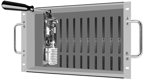 Attach the industrial main CPU into the leftmost backplane connector. Be sure it is firmly connected to its backplane connector. Then tighten the phillips-head screw.