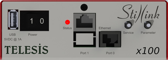 | USB 5VDC @ 1Amp | Stillink x100 power adapter connects here. Be aware that AC-DC power adapter is specially designed for the Stillink x100. Never use any adapter or power converter except the one supplied by Telesis. Otherwise, you may damage your system. |