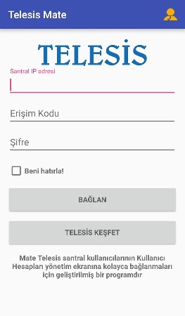 and more management options with a simple and easy interface. Telesis Mate requires three parameters to connect your lines user properties management screen. Telesis PBX IP and Port(if different from 80) is the IP address of the Telesis PBX. You may also use Telesis Discover button, please see below for detail. Access Code access code of desired User Preferences management screen Password of Access Code Remember Me stores these three parameters, so in your next lunch there will be no need to enter again. Telesis Discover feature allows users to find Telesis equipments connected to the same LAN (without need of Telesis equipments ip address or port number) and provides fast and easy connect to their User Preferences management screen with only Access Code and Password of the user. ![]() |