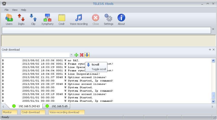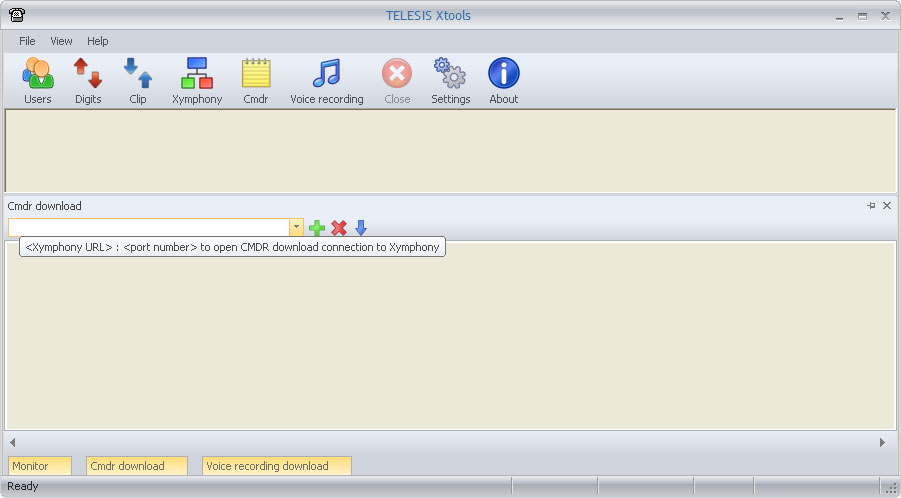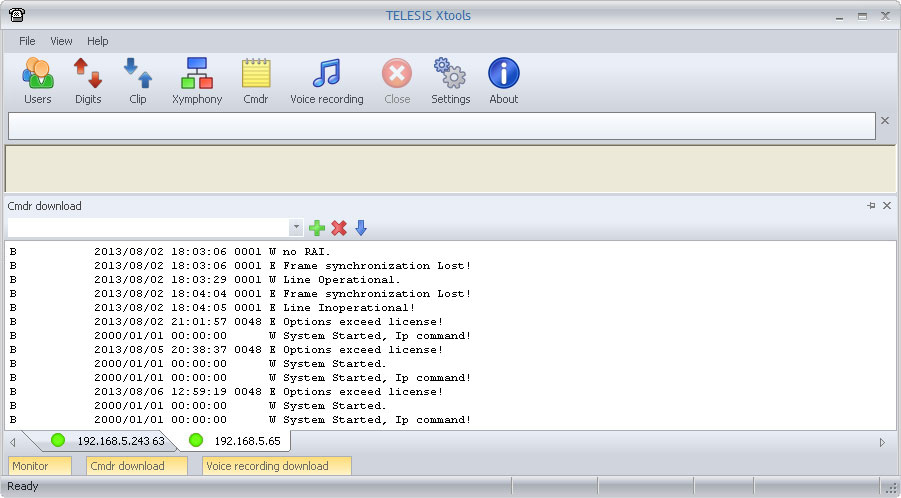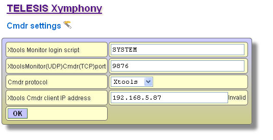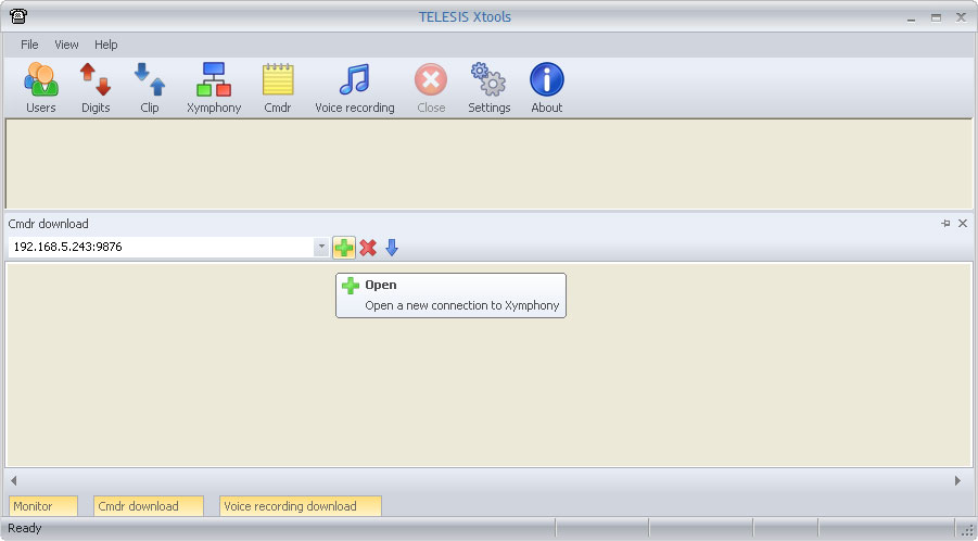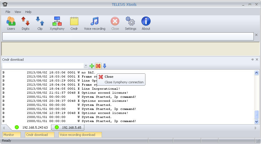 XToolsCMDRDownloadFunctionBefore downlading CMDR records with Connect to your Telesis system with a web broswer. The If protection dipswitch is not ON; By factory default, the CMDR port is 9876. If desired, the default value can be modified to another. Edit the If protection dipswitch is ON; It is fixed port, can not be modified to another. ![]() Note that it is also necessary to set After Telesis Xymphony system has been programmed appropriately, edit <Xymphony URL>:<port number> into the edit box to the left. Then click on While the XTools establishes the communication, YELLOW indicator is displayed on bottom left corner. If the communication fails for any reason, the indicator on the bottom left corner returns RED. Then check IP connection of your PC, CMDR parameters in Xymphony etc. If the communication is successfully established, the indicator on the bottom left corner becomes GREEN. And if there are CMDR records in the buffer of Telesis Xymphony system, these starts to be downloaded and also shown in download window. Downloaded or collected data is stored in the xtools.mdb file automatically. Xtools.mdb is a database file supported by Microsoft Access. It has call and information records. Maximum xtools.mdb file size is limited to 1GB. If xtools.mdb approaches to the limit; XTools should be stopped, xtools.mdb should be archived (with copying to another directory, renaming etc.) and a new mdb should be created with re-running XTools. The same XTools may connect up to four different Telesis Xymphony systems and collect their CMDR records at the same time. Then the created database file is common but records are marked with Xymphony IP addresses. At anytime, connection to a Telesis Xymphony system may be terminated with using the The |