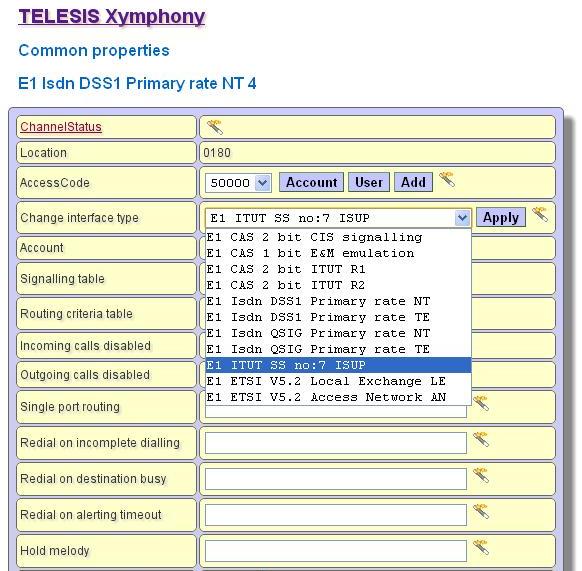 In Common properties page, Change interface type is used for changing the interface type. Select the desired signaling or protocol from the pulldown menu and press Apply button next to the right. After the page refreshes, click on OK button.